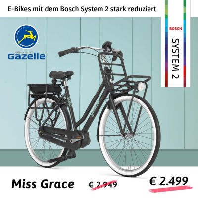 Premium E-Bikes zu reduzierten Preisen, zum Beispiel das stilvolle und transportfreudige Miss Grace von Gazelle mit Bosch Active Line Plus Motor, 500 Wh Akku und Nabenschaltung. Jetzt Probe🚴 fahren und das passende 😊 Einzelstück finden!