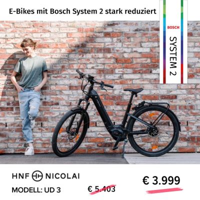 Premium E-Bikes zu reduzierten Preisen, zum Beispiel das UD3 von HNF Nicolai mit dem 85 Nm kräftigen Performance CX Motor, Gates Riemen und der stufenlosen Nabenschaltung Enviolo TR. Jetzt Probe🚴 fahren und das passende 😊 Einzelstück finden!