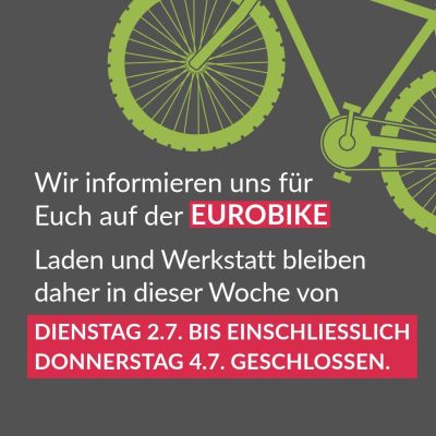 Morgen geht's ab zur Eurobike nach Frankfurt! Uns erwarten die 🚲🤩 neuesten E-Bikes und Fahrräder, 👀 interessantes Zubehör und natürlich fachlicher Austausch. Wir sind gespannt!